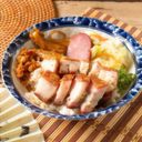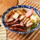 豬肉烤至外皮酥脆,肉質嫩滑多汁搭配白飯,滋味令人神往。(此描述僅供參考)