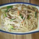 新鮮雞肉與麵條大火拌炒,肉質鮮嫩、順口鮮美的佳餚。(此描述僅供參考)