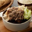豬五花、百頁豆腐、木耳、香菇、大白菜、金針菇配上鮑汁高湯加上特制醬料燜煮製作而成,每份餐點均附上一碗米飯