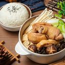 雞腿、百頁豆腐、木耳、香菇、大白菜、金針菇配上鮑汁高湯加上特制醬料燜煮製作而成,每份餐點均附上一碗米飯