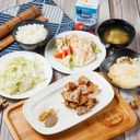 含高麗菜一份、小菜一份、白飯一碗、荷包蛋一顆、味噌湯一碗、甜點一份