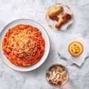 這是一份經典的番茄起司義大利肉醬麵,內含口感滑順的直麵,搭配波隆那紅醬,富有濃郁的蕃茄與肉香,再撒 上帕瑪森起司,風味絕佳。每一口都能享受到濃郁的番茄酸甜與肉醬的鹹香,是一款簡單卻充滿層次的美味義大利麵。內含(因原物料短缺,部分門市出餐時將以筆管麵取代直麵,各門市供貨狀況以實物為準,圖片僅供參考)直麵、豬肉、義大利肉腸、番茄丁、帕瑪森起司、波隆那肉醬(含牛肉)。