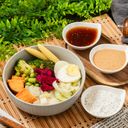 醬料擇一 | 地瓜、洋蔥、葉菜、水果、花椰菜、毛豆、玉米筍、水煮蛋、香鬆 | 菜色無法更換,想更換可 以點客製沙拉自行搭配 | 熱量:235cal | 蛋白質:12g