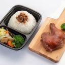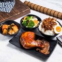 飯食,烤雞腿,含配菜及飲品。 每日新鮮電宰雞隻搭配獨門配方享受雞腿的鮮甜! 嚴選關山白米飯及台灣國產雞肉! 配菜每日均會變化,依當日為主。