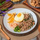 炒過豬絞肉搭配煎蛋與泰式甜辣醬 是泰國街邊常見的好味道