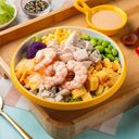 茂宜球Maui Go__ 1.佐料:毛豆仁 黃金泡菜 玉米 杏鮑菇 紫薯 玉子燒 2.蛋白質:鮮蝦 舒肥雞 367kcal 3.醬料:墨西哥辣醬 4.撒料:蒜酥 黑白芝麻