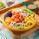 可愛球__ 1.佐料:毛豆仁 黃金泡菜 玉米 杏鮑菇 紫薯 玉子燒 2.蛋白質:鮭魚 舒肥雞 399.7kcal 3.醬料:和風胡麻醬 4.撒料:黑白芝麻 七味粉 芥末
