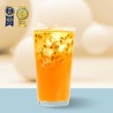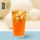 水果茶裡有百香及鳳梨果粒。以英式蜜桃風味茶為基底,添加百香果、鳳梨、柳橙三大台灣季節水果特調果露,讓紅茶的麥芽特色伴隨著蜜桃撲鼻的柔和香氣, 感受英國茶浪漫多變的樂趣。 口味推薦:微糖/微冰 大杯(L):總糖量:68克,總熱量:298大卡,咖啡因含量:黃色燈號 紅茶產地:斯里蘭卡