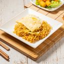 乾辣椒與軟嫩雞肉結合成經典宮保風 味,與麵條拌炒後香氣四溢!(此描述僅供參考)