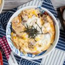 鮮嫩雞肉與美味滑蛋鋪在白米飯上,經典的美味丼飯。(此描述僅供參考)
