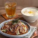 主餐固定為牛五花日式炒麵,附湯品及飲料。 獨門炒麵醬汁,加入牛五花拌炒, 含當日新鮮蔬菜:高麗菜、洋蔥。