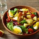 含美生菜, 蘿蔓, 綜合生菜, 紫高麗, 甜椒, 水煮蛋, 小蕃茄, 玉米, 蔓越莓乾及蘋果。