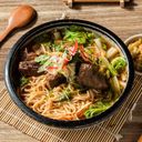 紙盒底部破損湯汁流出,麵煮的太軟了。葉菜不新鮮。