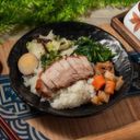 豬肉烤至外皮酥脆,肉質嫩滑多汁搭配白飯,滋味令人神往。(此 描述僅供參考)