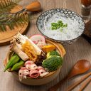 高麗菜、火鍋料、菇類、肉片、青菜、嫩豆腐、泡菜、