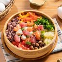 紫米.泡椒辣脆油.半顆洗選蛋.化骨秋刀魚.玉米粒.小黃瓜.紫洋蔥.蜜黑豆.黃金泡菜.墨西哥辣椒