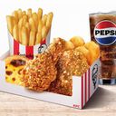 咔啦脆雞(中辣)6塊(炸雞恕不開放選擇部位),香酥脆薯(中)1份及百事可樂1瓶(1.25公升)。