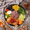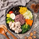 含紫米飯、蛋、及水煮時蔬 (配菜以當日新鮮蔬果為主) 雞肉約130克