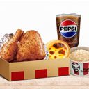 義式香草紙包雞1份、雞汁風味飯1份【供應至20:00,20:00之後視餐廳營運狀況供應雞汁風味飯或香酥脆薯中1份】、上校雞塊4塊(含糖醋醬x1)、原味蛋撻1顆及中杯飲料1杯【預設為百事可樂(中),如需更換請點選下方】
