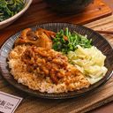 每日慢火熬煮金黃透嫩香濃滷肉,秉持初心、匠人精神將肥瘦肉完美比例融合,濃郁的滷汁和滷肉香氣搭配新鮮現炒配菜, 垂涎三尺 | 配菜依季節調整,實際以當日製作為準