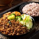 工熱炒泰式打拋豬、鹹香帶微辣炒得入味的豬絞肉及濃濃的湯汁、搭配香Q五穀米飯、香氣十足, 真的會一口接一口停不下來~