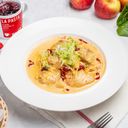 奶油醬汁渲染了鮮嫩鮭魚與Q彈麵條,讓每一口都令人陶醉。(此描述僅供參考)