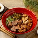 牛筋與牛肉燉煮入味,濃郁鮮美的湯頭搭配麵條享用,大享受!(此描述僅供參考)