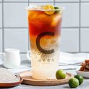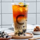 大杯。冰飲。奶茶搭配自煮粉粿及布丁,粉粿軟糯Q彈,布丁香甜滑嫩。總糖量73公克 總熱量553大卡 總咖啡因介於101~200亳克。茶葉原產地:斯里蘭卡/印尼。