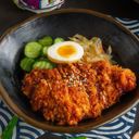 特選去骨炸雞腿排,浸泡於秀夫特製蜜汁醬中,再以慢火烘烤,鮮甜的肉汁伴隨著微焦炭的香氣,多層次的口感令人魂牽夢縈。 肉品原產地:台灣 附三樣隨機日式小菜、溏心蛋半顆、味噌湯一碗。