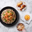 內含白飯、燻雞絲、蘑菇、青花菜、奶油白醬。這道奶油燻雞蘑菇燉飯,使用台灣優質一等米作為基底,搭配濃郁的奶油白醬,混合煙燻雞肉與嫩滑的蘑菇,再加 入清爽的青花菜,為整道料理增添口感與色彩。每一口都能享受到奶香與燻雞的迷人風味,是一道豐富且飽滿的燉飯料理,喜歡燉飯料理的千萬別錯過。