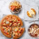 必勝客經典海鮮比薩,使用爽脆鮮蝦、鮮甜飽滿的帆立貝,加上鮮美蛤蜊、蟹味絲帶來滿滿海味,一次享受四種海鮮!經典不敗的香濃莫札瑞拉起司搭配比薩紅醬,襯托出海鮮的鮮美滋味。