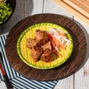 口感豐富、飽足滿分,嫩滑蒸蛋搭配多汁排骨,鋪於熱白飯上