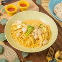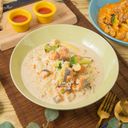培根炒香加入蘑菇洋蔥丁,再加入一隻蝦子,香濃可口